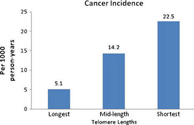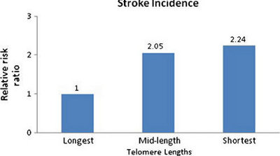 An example of telomere length and incidence of cancer on the left and telomere length to incidence of stroke on the right graph.