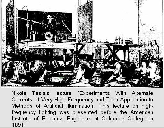 Tesla became known for the lectures at which he demonstrated his inventions and concepts with a theatrical flair. Many attendees were laymen who had little comprehension of what Tesla said, but were mesmerized by the bolts of lightning that leapt from his ominously humming coils, and the unwired light bulbs that lit at the touch of Tesla's hand. -------------------------------------------------------------------------------- Additional information on Tesla: Tesla Biography;Get your own authentic photograph; patents, photos |